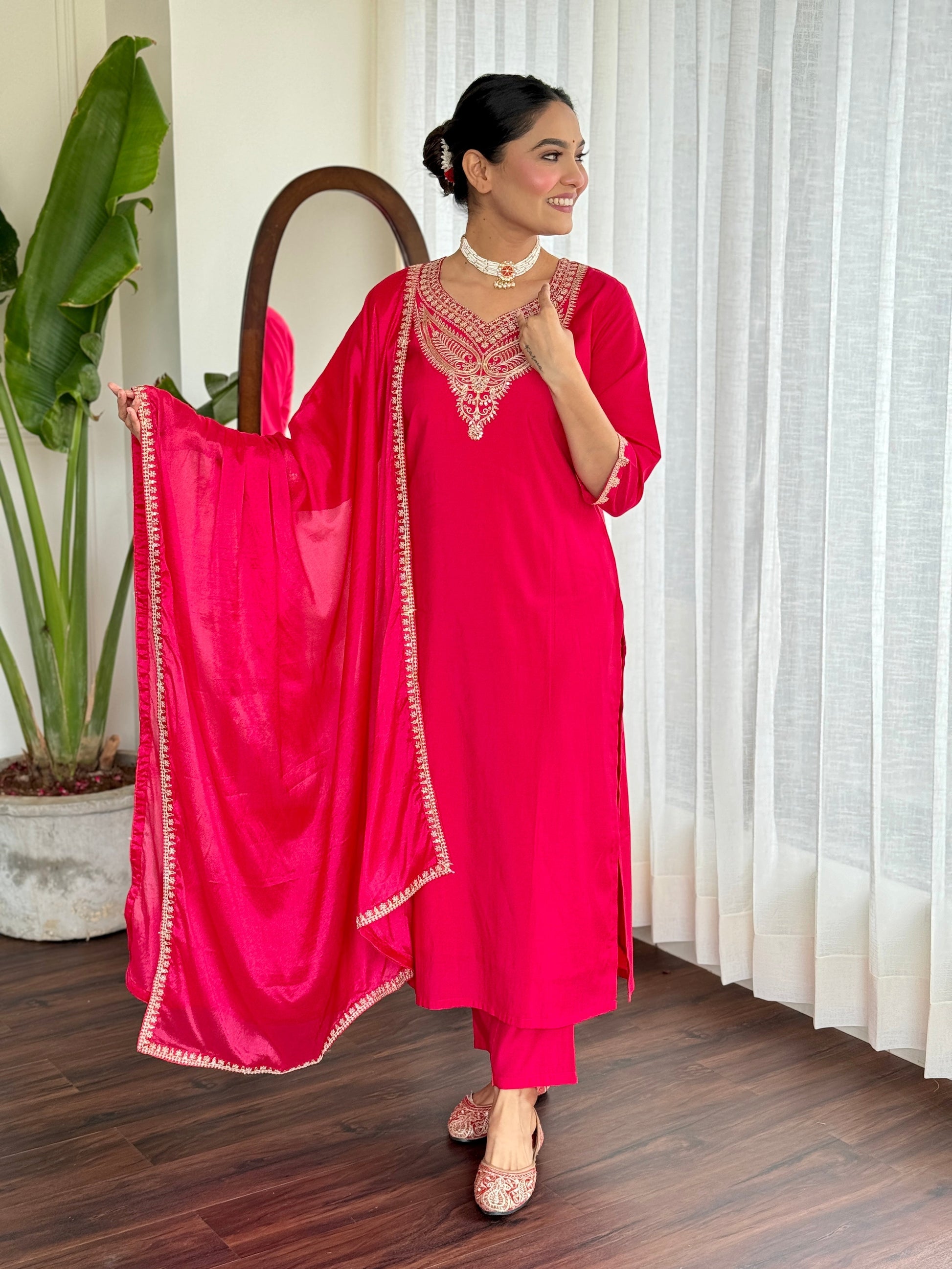 Beautifully designed that seamlessly combines tradition kurta set TOP FABRIC: CHANDERI VISCOSE BOTTOM FABRIC : CHANDERI VISCOSE DUPATTA : CHINON EMBOIDERY BORDER WORK TOP WORK: EMBROIDERY BOTTOM WORK : PLAIN DUPATTA WORK : PRINT WORK:EMBROIDERY LENGTH:46 INCH