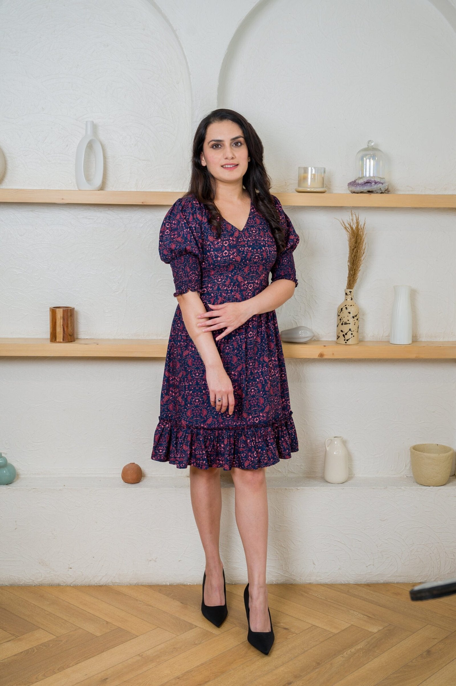 \nUpgrade your going-out closet with this premium floral dress. Its rich hue, V-neck, and flared A-line skirt make it a must-have. With smocked details on the sleeves and ruffle hem, this customizable and made-to-measure mini dress is perfect for holidays, dates, and workwear. Transition effortlessly from day to night with its elegant style.\n\nLength: 36 Inches\nMaterial: Cotton\nModel's Height is 5'4" and wearing size S\n\n